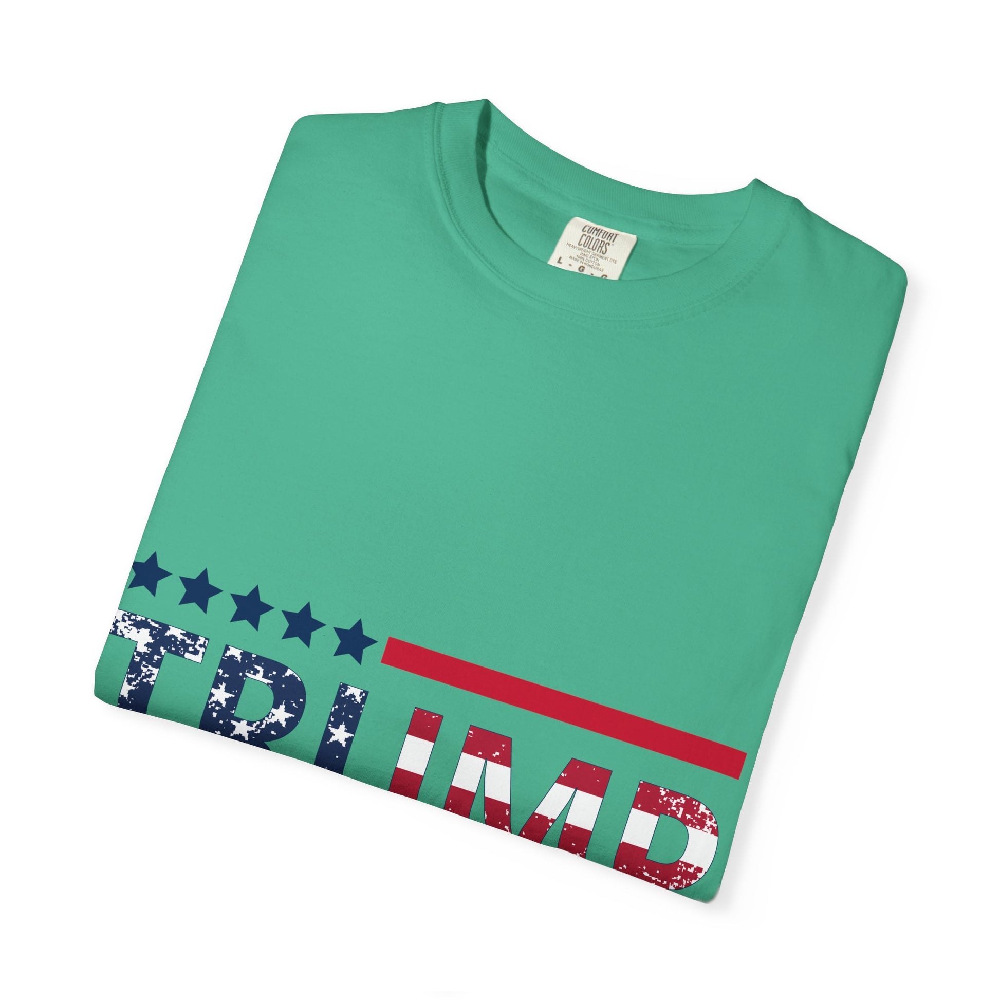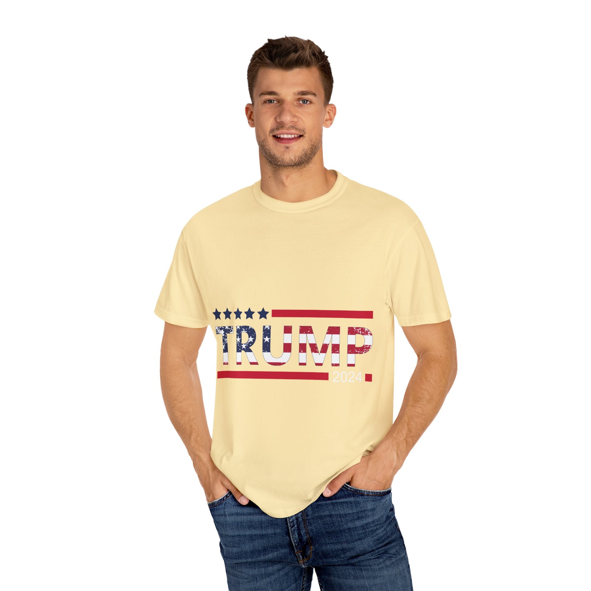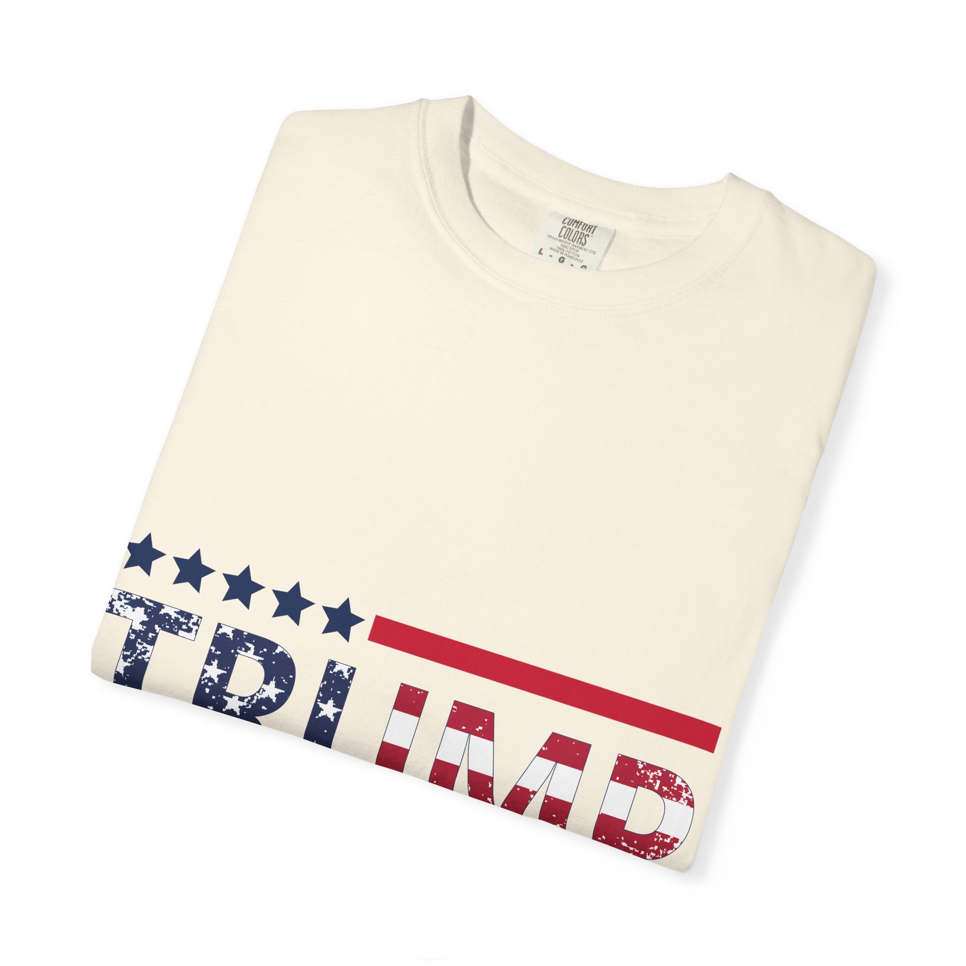 A relaxed, garment-dyed cotton tee with vintage texture and bold political graphics that speak plainly. The soft, pre-shrunk 100% ring-spun cotton breaks in with wear, showing off the muted, lived-in color that comes from post-construction dyeing. On the front sits a distressed, flag-inspired wordmark; the back features a high-contrast portrait set against a bold star and provocative slogan. Lightweight yet substantial (medium-weight 6.1 oz), the shirt hangs casually and holds shape with double-needle seams and a tubular knit body. Wear it to rallies, meetups, or days when you want your views worn loud and visible.