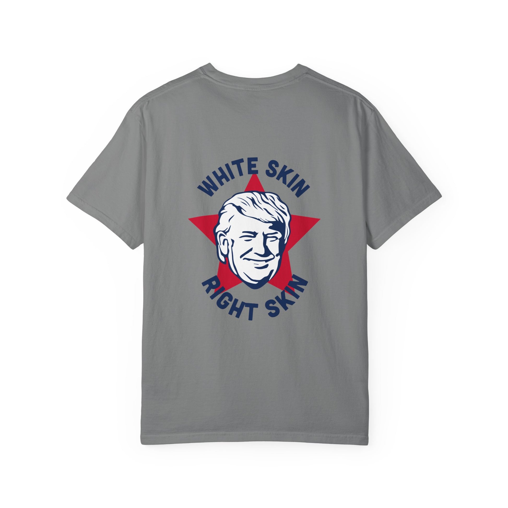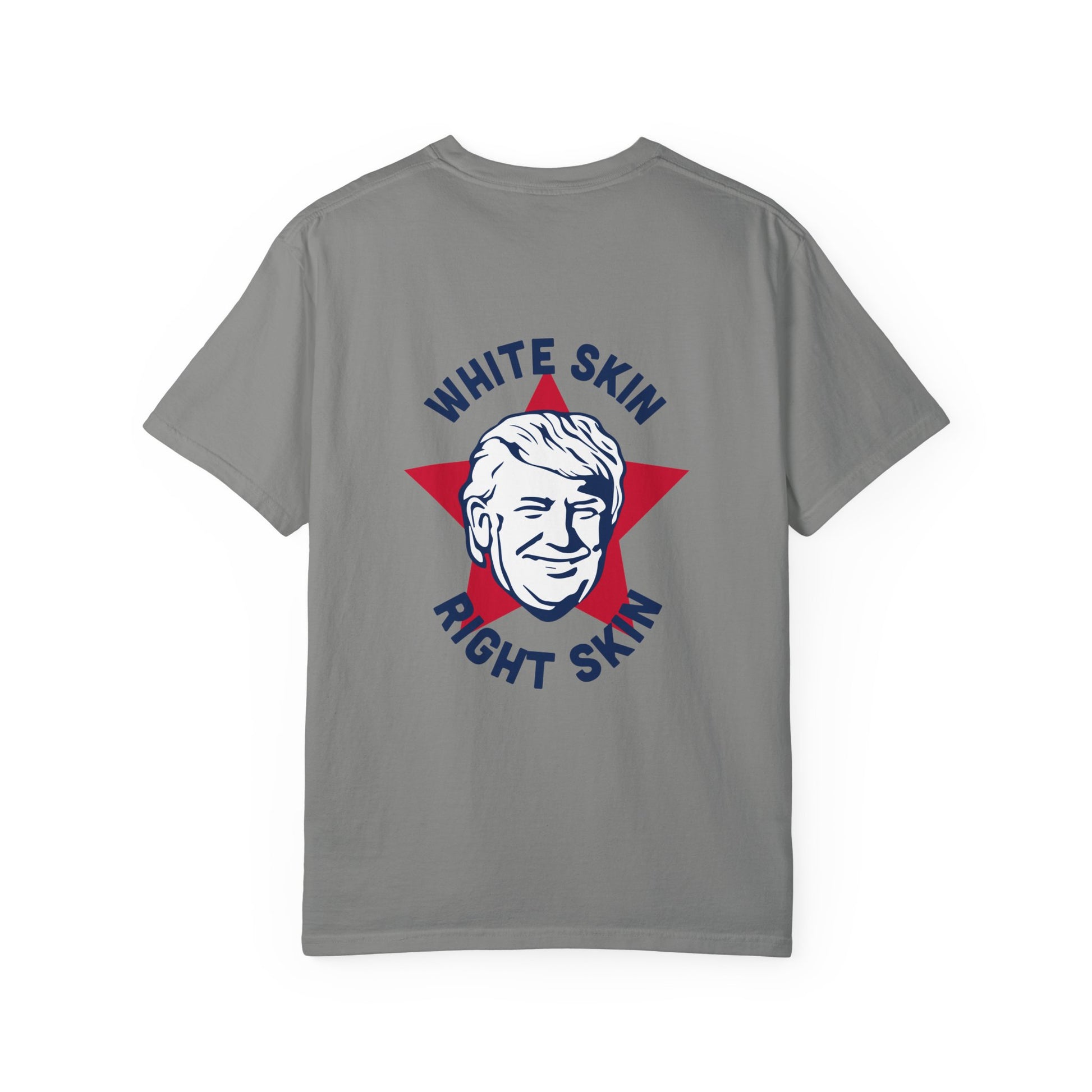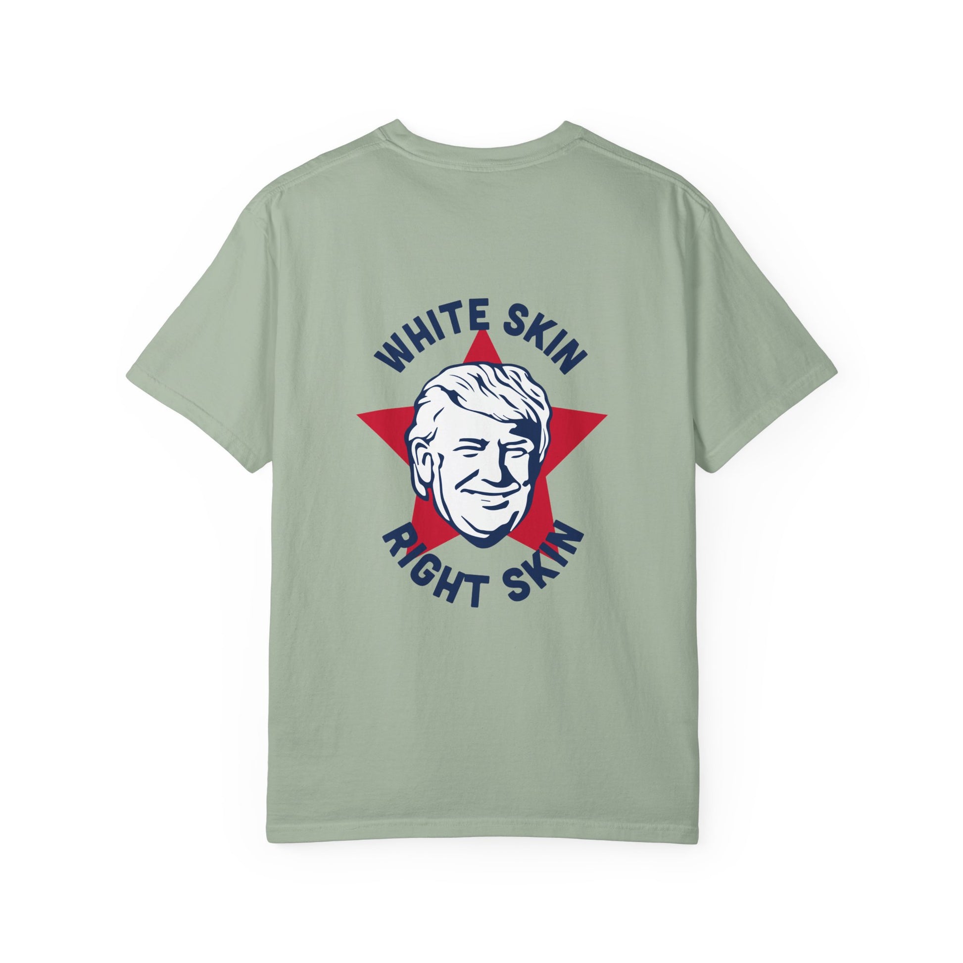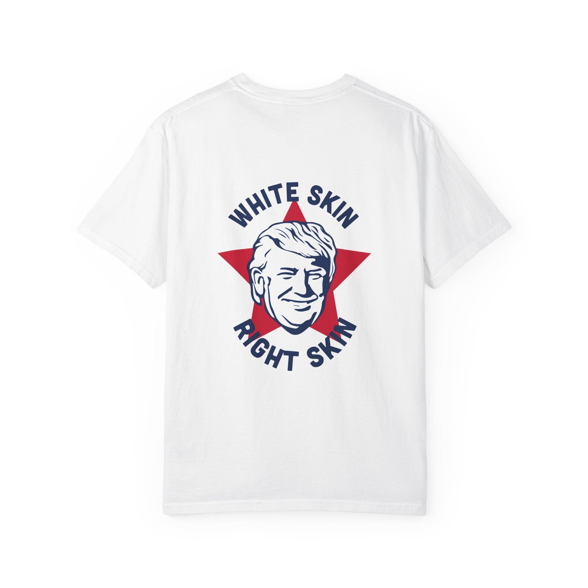 A relaxed, garment-dyed cotton tee with vintage texture and bold political graphics that speak plainly. The soft, pre-shrunk 100% ring-spun cotton breaks in with wear, showing off the muted, lived-in color that comes from post-construction dyeing. On the front sits a distressed, flag-inspired wordmark; the back features a high-contrast portrait set against a bold star and provocative slogan. Lightweight yet substantial (medium-weight 6.1 oz), the shirt hangs casually and holds shape with double-needle seams and a tubular knit body. Wear it to rallies, meetups, or days when you want your views worn loud and visible.